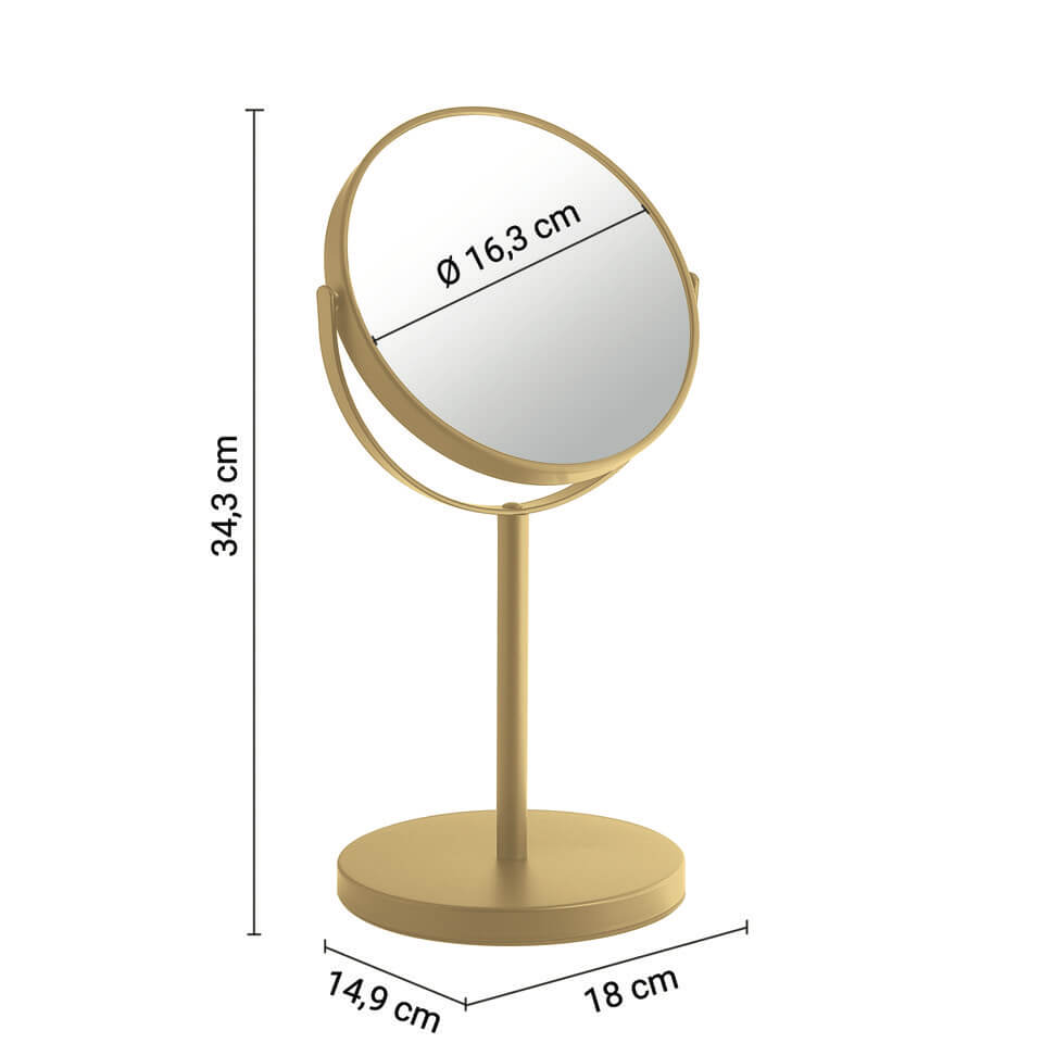 Spejlets størrelse på Ø18 × H ¡35 cm giver en god balance mellem kompakt design og praktisk spejlflade. Det er stort nok til komfortabel brug, men samtidig diskret nok til ikke at dominere badeværelset visuelt. Den slanke form gør spejlet let at placere på badeværelsesbordet eller i nærheden af vasken, hvor det er nemt at tilgå, når du har brug for det.